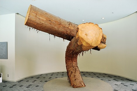 在“Vega Hall”的入口处可以看到两棵巨大弯曲盘绕着的杉树。第一眼看上去会有不稳定的感觉,但是其完美的平衡感将我们对既成概念一扫而光。这与大家平常对“杉树一定是笔直的” “两棵树虽然弯曲,但固定在了一个本不会固定住的点上” 的先入之见格格不入。这个作品让我们感受到创造是需要打破一成不变的思想与概念,创造不是轻而易举就能实现的。