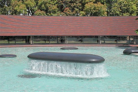 在设施正面的水池中,很多黑色巨石悬浮在“喷泉之上”,有的石头甚至沿着水池垂落弯曲着。这不可思议的景观吸引了每一位来访者的注意力,丰富了我们的想象力,告诉我们转换思维方式,不拘泥于常识的重要性。